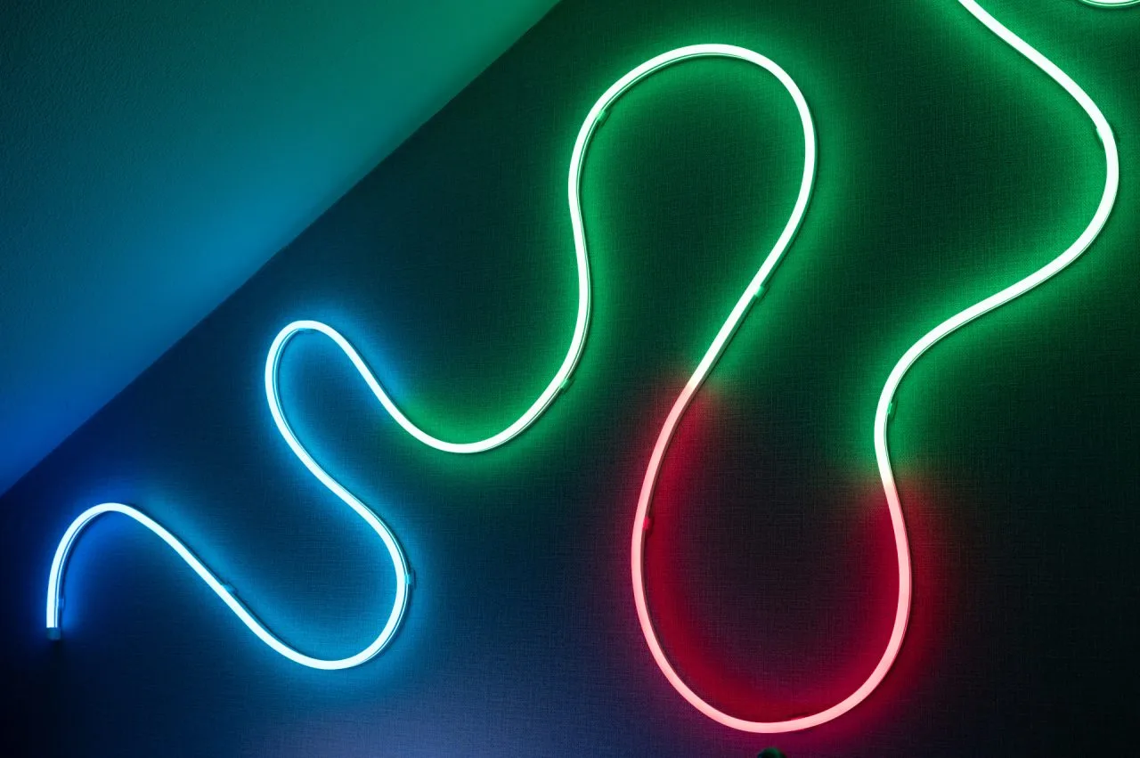 A fita de LED AI Neon N1 também oferece reprodução de cores vibrantes e iluminação uniforme em toda a sua extensão. O revestimento de silicone distribui a luz homogeneamente e evita pontos de LED visíveis. A fita cria um efeito particularmente impressionante quando usada como fonte de luz direta ao longo de paredes ou bordas de móveis.