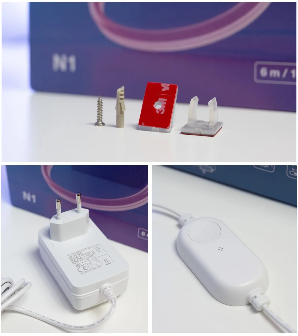 A fonte de alimentação da fita é conectada separadamente; na extremidade, há um pequeno módulo de controle com um interruptor e um microfone integrado para sincronização com a música.